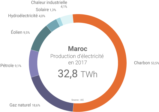 Le Maroc a pour ambition de fortement développer les énergies renouvelables dans le secteur de la production d’électricité : en 2009, il a été fixé pour objectif de porter à 42% la part de ces filières en 2020 dans la puissance installée totale du parc électrique marocain. Le Maroc a depuis précisé que les énergies renouvelables devront compter pour plus de 52% des capacités électriques du pays à l’horizon 2030. Pour cela, le pays mise sur les différentes filières renouvelables : éolien (9,5% de la production électrique en 2017), hydroélectricité (4%), solaire (1,3%) incluant en particulier les centrales thermodynamiques, etc.