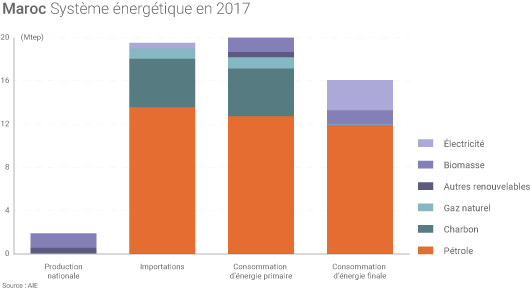 La production nationale d’hydrocarbures étant « négligeable » selon l’AIE (malgré quelques projets prometteurs en développement, notamment autour du permis gazier de Tendrara), le Maroc dépend très fortement des importations. La facture énergétique du Maroc liée à ces importations s’est élevée à 69,5 milliards de dirhams en 2017, soit environ 6,3 milliards d’euros.