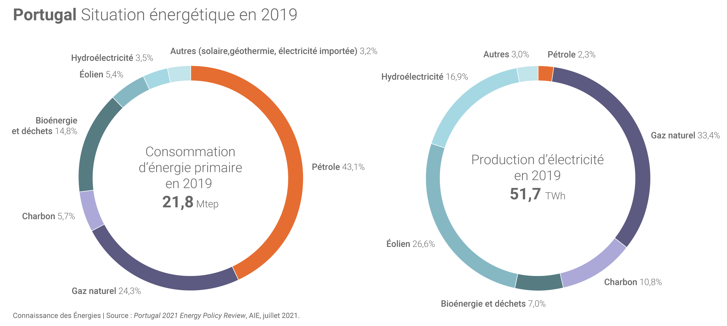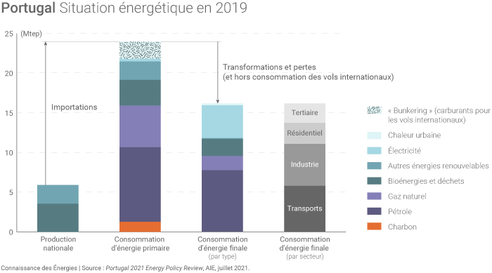 L'AIE souligne que le Portugal a déjà « atteint un haut niveau d'électrification » : en 2019, l'électricité comptait pour près d'un quart de la consommation finale du pays (et pour 56% de la consommation d'énergie dans les bâtiments). Précisons que l'arrêt de 2 centrales à charbon en 2021 (centrale de Sines de 1,3 GW arrêtée au mois de janvier et centrale de Pego de 600 MW qui sera arrêtée en novembre) va réduire les émissions de gaz à effet de serre associées à la production portugaise d'électricité.