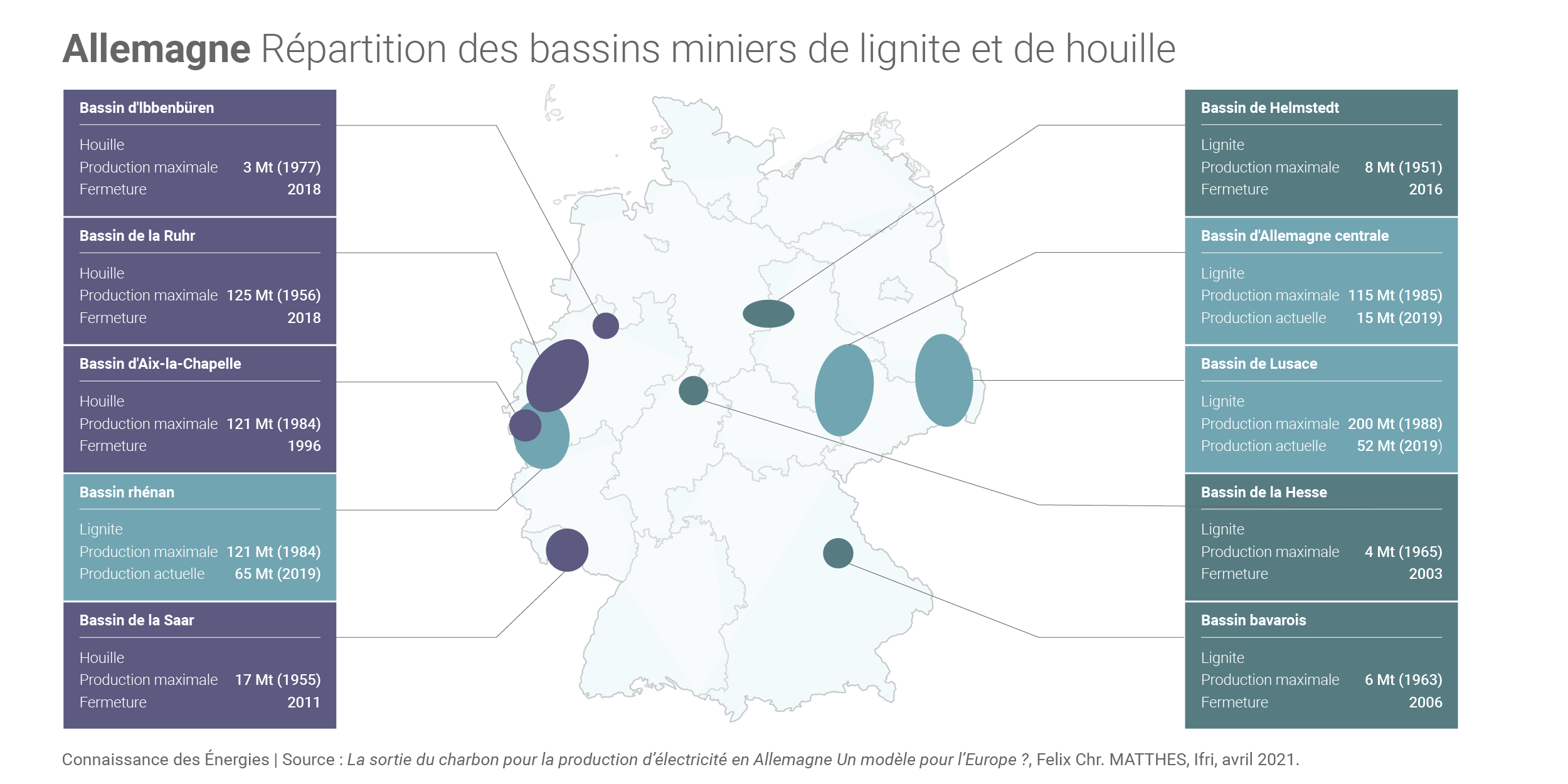 « En Allemagne, l’année 2020 aura marqué le début de la sortie définitive de la production d’électricité à partir du charbon et plus généralement de l’extraction du charbon ». Des premières fermetures de centrales à charbon ont en effet eu lieu dans le cadre du « programme de sortie » adopté par l'Allemagne.