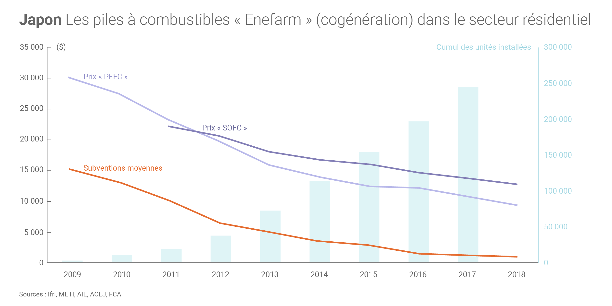 Dans le secteur résidentiel, le prix des piles à combustible de type « PEFC » (Polymer Electrolyte Fuel Cell) a été réduit de près de 70% depuis leur arrivée sur le marché. (©Connaissance des Énergies, d’après Ifri)