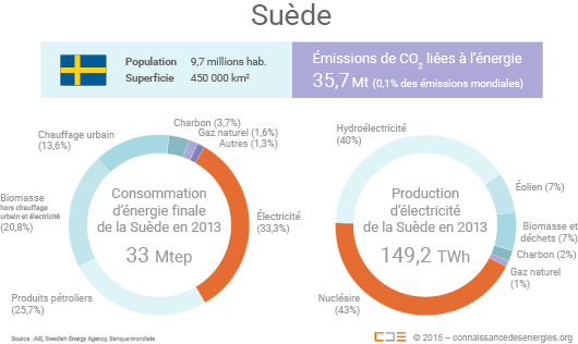 La production électrique de la Suède est « décarbonée » à près de 97%, essentiellement grâce aux énergies nucléaire (la Suède dispose d’un parc de 10 réacteurs) et hydraulique (plus de 2 000 centrales hydroélectriques). Les réseaux de chaleur sont pour leur part « chauffés » à près de 60% à partir de biomasse et ne dépendent plus qu’à 2,7% des produits pétroliers en 2013 (contre 98% en 1970).