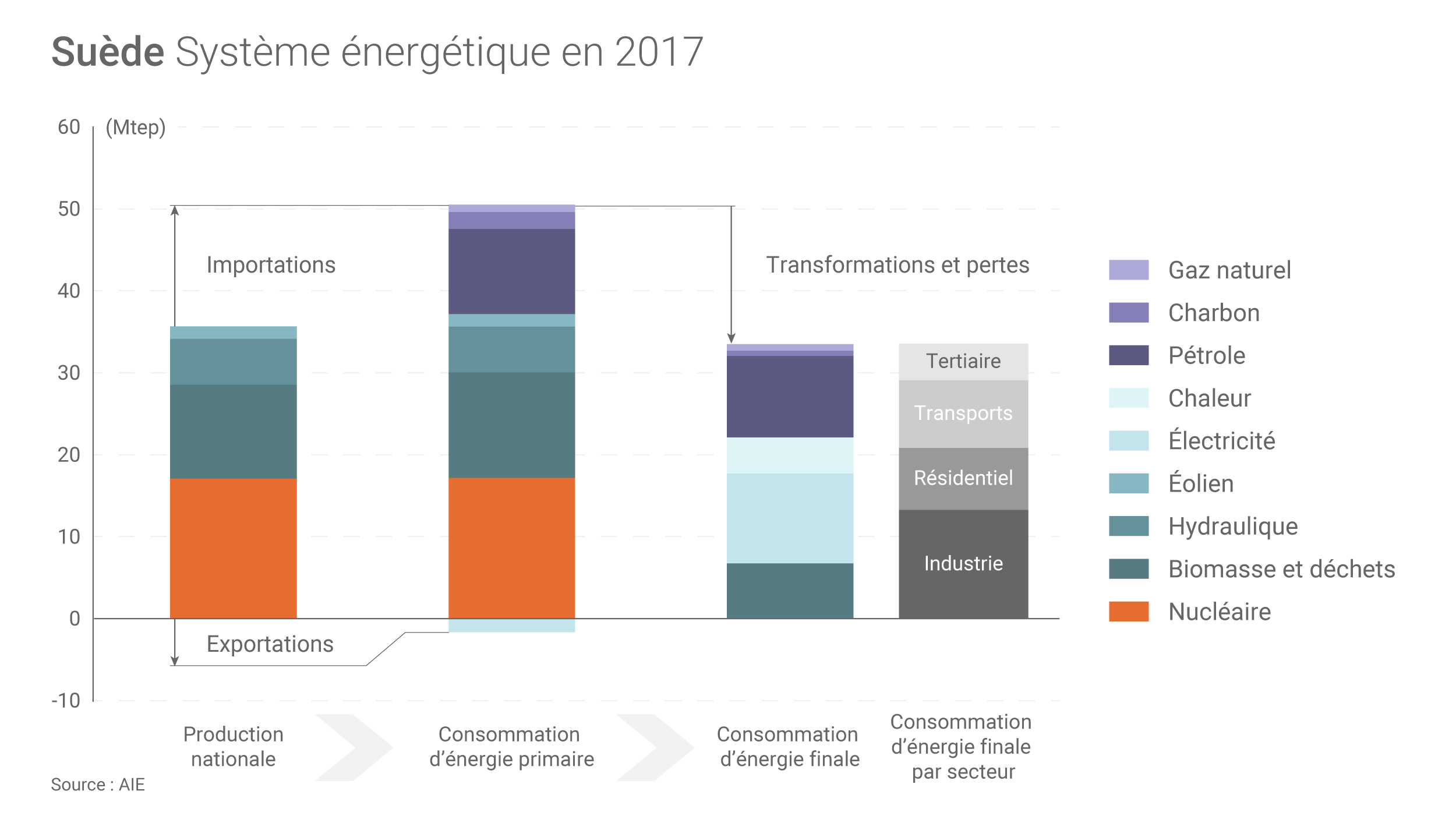 La Suède est ainsi le pays membre de l’AIE ayant la plus faible part d’énergies fossiles dans sa consommation d’énergie primaire (près de 27% en 2017). Le pétrole compte pour « 84% des importations d’énergie » du pays selon l’AIE(2), alimentant le secteur des transports(3) (2e plus gros consommateur d’énergie après l’industrie) dont provenaient 52% des émissions nationales de CO2 en 2017.