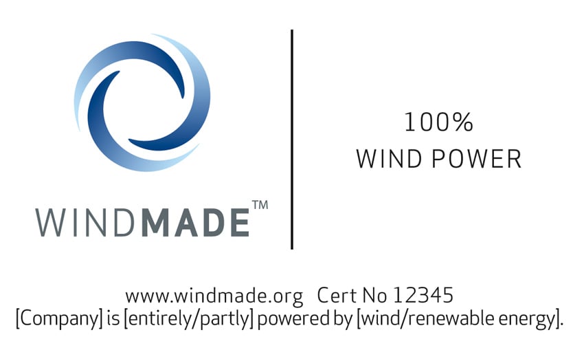Le logo du label WindMade indique la part d'électricité utilisée, issue de l'énergie éolienne, ici 100% (©WindMade)
