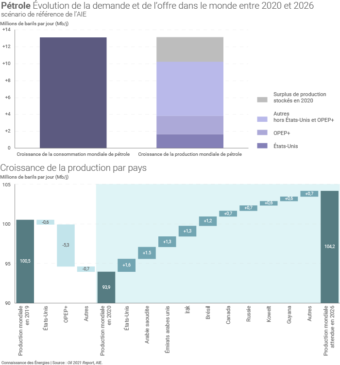 En matière d’offre pétrolière, « l’incertitude accrue » revient aussi en boucle dans les prévisions de l’AIE(2). Dans le scénario de référence de l'Agence, la production mondiale devrait augmenter de 10,2 Mb/j d'ici à 2026 pour faire face au rebond de la consommation mondiale.