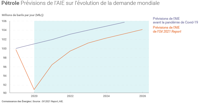 Malgré cette croissance attendue (en l'absence d'« accélération des transitions énergétiques »), l'AIE souligne que la pandémie mondiale affectera durablement le niveau de la consommation mondiale de pétrole : dans son rapport de 2021, la demande attendue en 2025 est ainsi inférieure de 2,5 Mb/j au niveau qui était anticipé par l'AIE dans son rapport annuel précédent présenté début 2020.