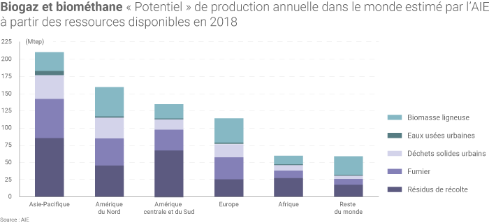 En 2018, la production mondiale de biogaz et de biométhane s’est toutefois limitée à près de 35 Mtep (dont 3,5 Mtep pour le biométhane), soit seulement une petite« fraction du potentiel estimé » par l’AIE (570 Mtep par an pour le biogaz et 730 Mtep par an en incluant le biométhane). Cette production est aujourd’hui principalement concentrée en Europe (très majoritairement en Allemagne(3)). Elle valorise essentiellement des résidus agricoles et du fumier(4).