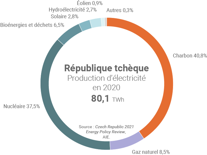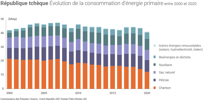 La République tchèque est le 3e pays consommant le plus de charbon en Europe après l'Allemagne et la Pologne(2). Ce combustible se trouve au cœur du système énergétique tchèque : il a compté pour 30,1% de la consommation nationale d'énergie primaire en 2020, ce qui en fait de loin la principale source d'énergie de ce pays de près de 10,7 millions d'habitants, devant le pétrole (21,1%), le nucléaire (19,5%) et le gaz naturel (18,5%).