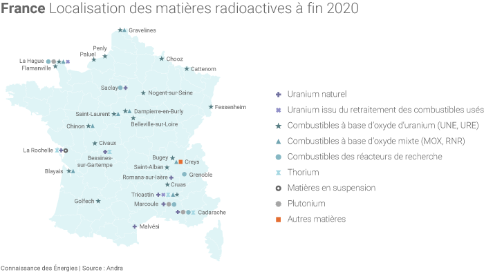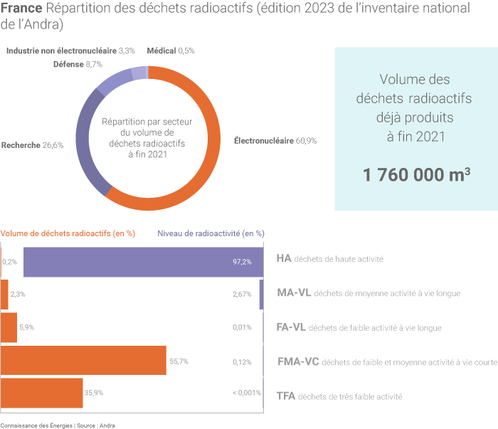 L'Andra fait état d'environ 1 760 000 m3 de déchets radioactifs « déjà produits à fin 2021 » stockés sur le territoire français, soit une hausse de près de 220 000 m3 de déchets par rapport au précédent inventaire de l'Agence datant de 2018 (et portant sur les données à fin 2016).