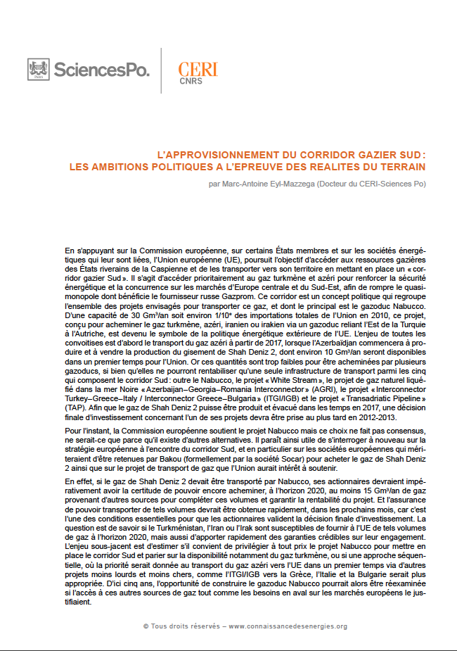 L'Union européenne entend mettre en place un « corridor gazier Sud » pour sécuriser son approvisionnement en gaz avec les ressources des États riverains de la Caspienne. Une ambition politique qui peut se heurter aux réalités du terrain, comme l'explique cet article publié par le CERI (Centre d'études et de recherches internationales, rattaché à Sciences Po CNRS).