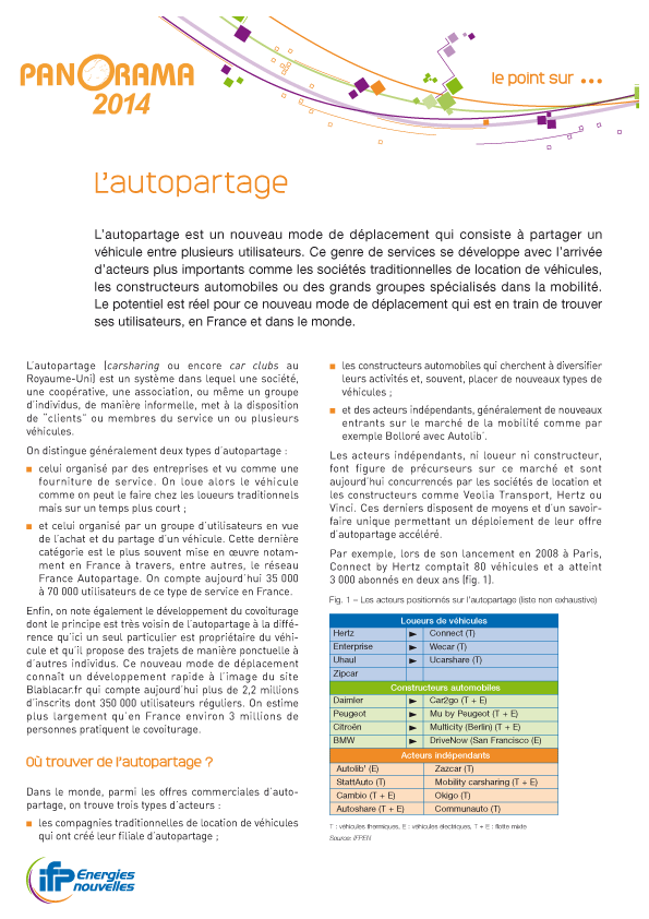 IFP Energies nouvelles présente dans cette étude les différents types d’autopartage existants et leur niveau de développement dans le monde. La Suisse serait le 2e pays européen derrière l’Allemagne à recourir à l’autopartage : près de 1% de la population helvétique souscrirait à ce service. Celui-ci est appelé à poursuivre sa croissance pour des raisons économiques, écologiques ou encore pratiques : un véhicule individuel n’est actuellement utilisé que 5% du temps en moyenne.