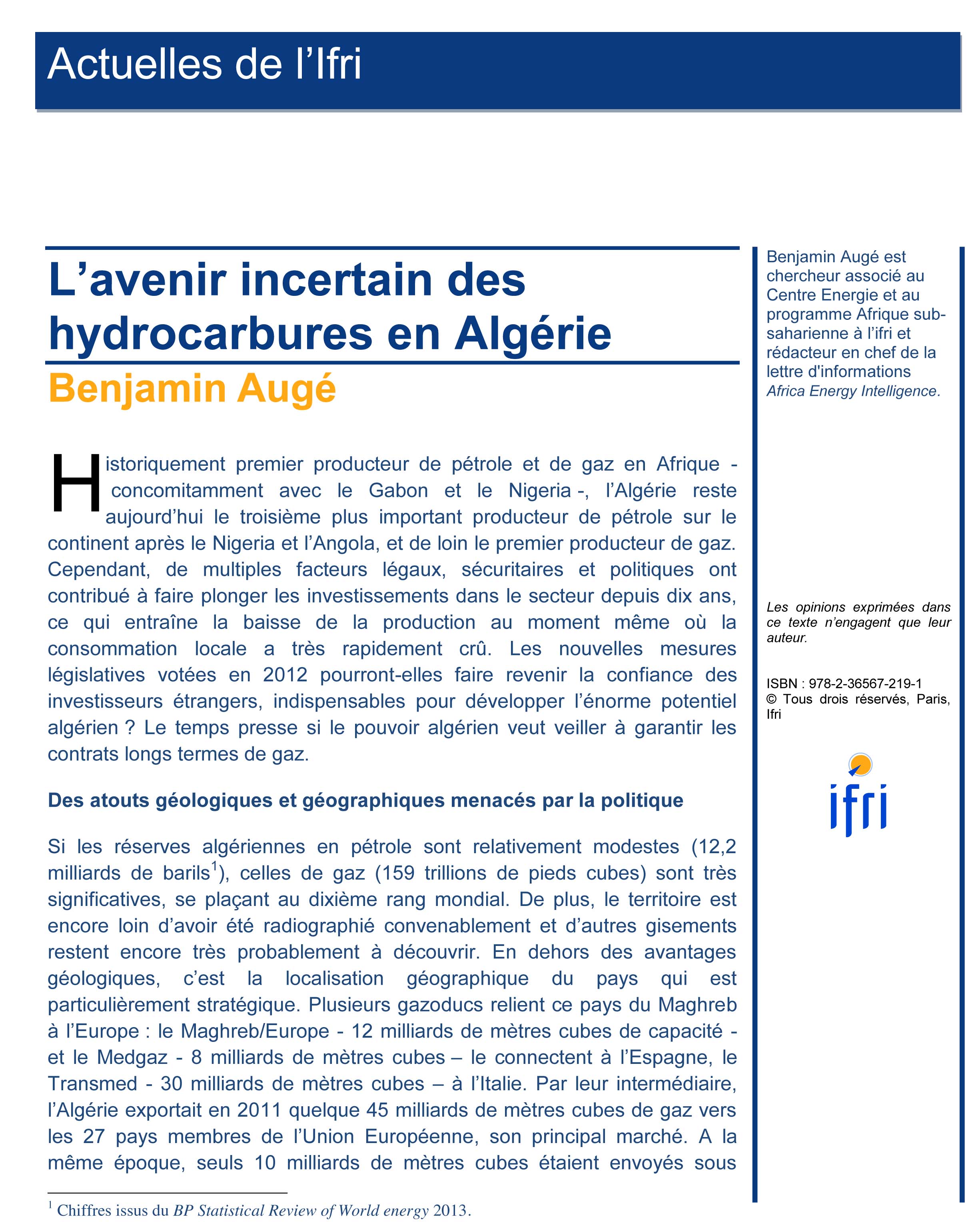 Benjamin Augé, chercheur associé à l’Ifri et rédacteur en chef de la lettre d’informations Africa Energy Intelligence, décrypte le tournant auquel se trouve aujourd’hui l’Algérie. Il expose également les espoirs et perspectives de la nouvelle loi pétrolière adoptée en conseil des ministres en septembre 2012. A moins de 6 mois des élections présidentielles, il délivre les ordres de grandeur du secteur des hydrocarbures en Algérie ainsi que les facteurs qui pourraient conditionner son avenir.
