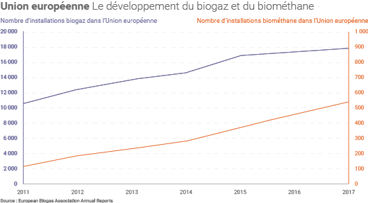 À fin 2017, l'Union européenne comptait 17 783 installations de biogaz (dont la moitié situées en Allemagne) et 540 installations de biométhane (biogaz ayant subi une étape de purification, lui permettant d'être injecté dans les réseaux gaziers) selon les dernières données de l'European Biogas Association.