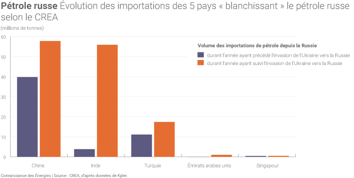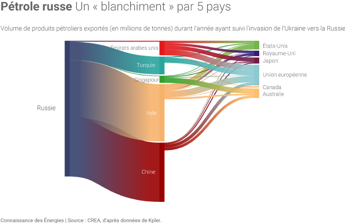 Les 5 pays ciblés par le CREA (l'Inde, la Chine, la Turquie mais aussi les Émirats arabes unis et Singapour) important du pétrole brut russe ont, après raffinage, exporté des quantités importantes de produits pétroliers vers les pays ayant imposé des sanctions à la Russie : les exportations de ces 5 pays vers la coalition ayant fixé un prix plafond au pétrole russe ont ainsi augmenté de près de 10 millions de tonnes au cours de l'année suivant l'invasion de l'Ukraine par rapport aux 12 mois précédents (ce qui correspond à une hausse en valeur de près de 80% selon le CREA, + 18,7 milliards d'euros).
