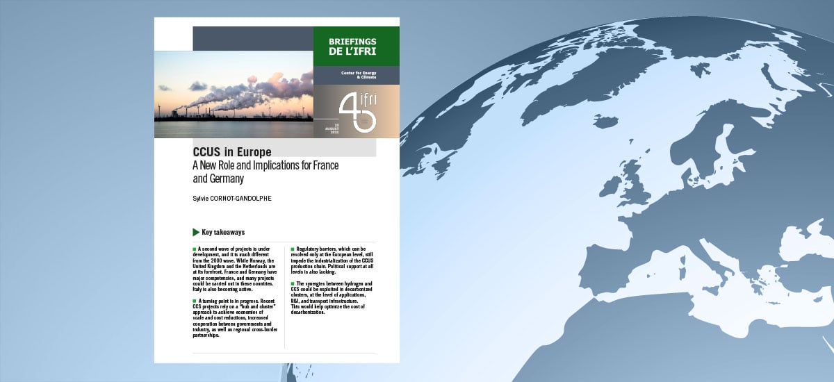En Europe, la Norvège (avec notamment son projet Northern Lights(1)), le Royaume-Uni et les Pays-Bas sont « à la pointe » du développement du CCUS mais la France et l'Allemagne disposent également de nombreuses compétences dans le domaine(2), souligne Sylvie Cornot-Gandolphe. Toutefois, les technologies CCUS, au coût élevé, font encore face à de nombreux défis d'ordre économique, réglementaire et sociétal : « des verrous réglementaires, qui ne peuvent être résolus qu’à l’échelon européen, entravent encore l’industrialisation de la chaîne CCUS » et un plus fort soutien des pouvoirs publics est nécessaire pour développer cette filière(3).