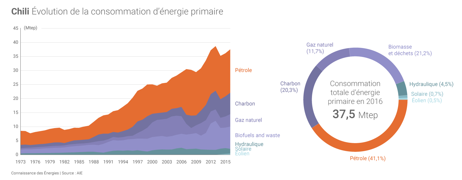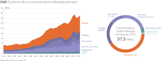 A l’heure actuelle, la consommation d’énergie primaire du Chili repose encore à près de 73% sur les énergies fossiles selon les dernières données de l’AIE portant sur l’année 2016. Le pétrole satisfait à lui seul plus de 41% des besoins énergétiques du pays, la biomasse et les déchets constituant la deuxième source d’énergie (21,2% du mix chilien).