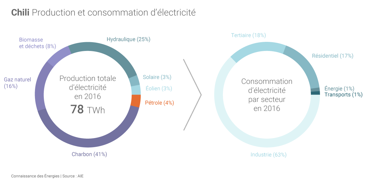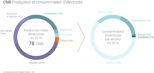 En 2016, près de 63% de la consommation chilienne d’électricité a été absorbée par l’industrie. (©Connaissance des Énergies, d’après AIE)