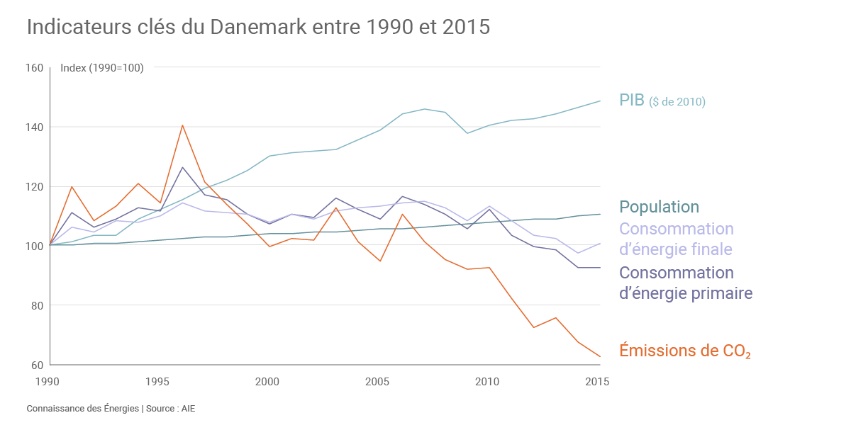 Entre 2005 et 2015, le Danemark a réduit ses émissions de gaz à effet de serre de 27% alors que son PIB a augmenté d’environ 7% durant cette période selon l’AIE. Dans le secteur énergétique, ses émissions ont baissé de 34%, les transports et la production électrique restant les principaux secteurs émetteurs.
