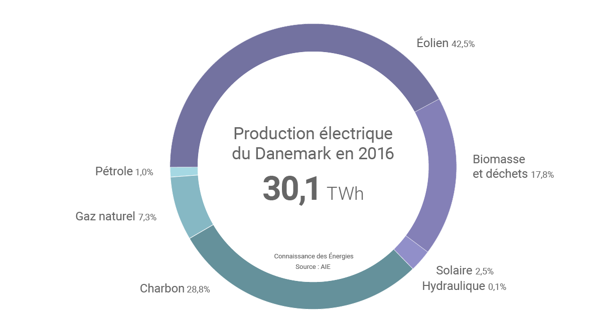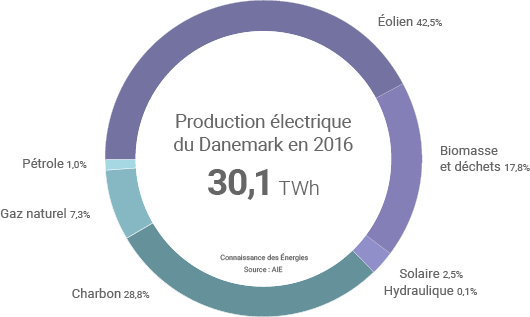 Le Danemark a fait très sensiblement évoluer son mix électrique au cours des deux dernières décennies, l’éolien et les bioénergies ayant progressé au détriment du charbon. En 2016, la production électrique nationale reposait à près de 42,5% sur l’éolien (cette part était même de 48,8% en 2015 grâce à des meilleures ressources en vent). La part du charbon dans ce mix électrique a pour sa part baissé de plus de 90% au début des années 1990 à 28,8% en 2016.