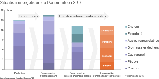 Au Danemark, « on a du pétrole » et on poursuit néanmoins une transition énergétique rapide dont l’AIE salue les avancées (réduction des émissions de gaz à effet de serre, développement des énergies renouvelables, amélioration de l'efficacité énergétique, importance de la cogénération, etc.). Producteur d’hydrocarbures depuis les années 1970, ce pays scandinave de 5,7 millions d’habitants est exportateur net de gaz et produit quasiment autant de pétrole (142 000 barils par jour en 2016) qu’il en consomme(2).