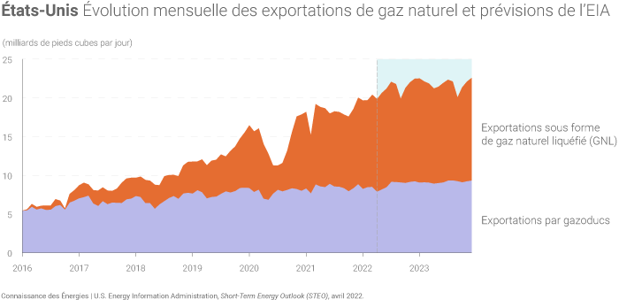 En 2021, les exportations de GNL des États-Unis ont pour la première fois dépassé le niveau de ses exportations gazières via gazoducs.
