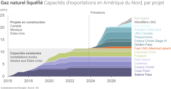 Selon l'EIA américaine (Energy Information Administration), alors même que les États-Unis occupent déjà une place centrale sur ce marché, 4 nouveaux projets de capacités de liquéfaction devraient être mis en service entre 2024 et 2027 : Port Arthur, Rio Grande, Plaquemines et Corpus Christi Stage III avec une capacité d'exportation cumulée de 7,7 Gft3/j)