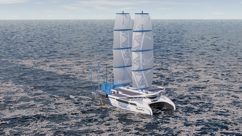 Le Manta sera le « premier bateau-usine capable de collecter et valoriser en mer de grandes quantités » de déchets plastiques flottants. Présentation de ce catamaran qui doit être mis à l’eau courant 2024.
