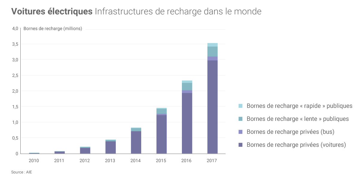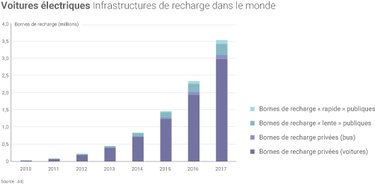 Motif d'inquiétude pour certains utilisateurs, l'autonomie des véhicules électriques pose la question du développement des infrastructures de recharge (publiques et privées). À fin 2017, le nombre de bornes de recharge privées (à domicile ou sur le lieu de travail) était estimé à presque 3 millions par l’AIE. Les 430 000 points de recharge publics font office de « complément » (15 978 en France), seul un quart d’entre eux assurant une recharge « rapide(6) ». Le développement de cette recharge rapide est « particulièrement important dans les environnements urbains en raison des contraintes d’espaces » mais aussi pour « augmenter l’attrait des véhicules électriques » en vue de longs trajets, insiste l'AIE.