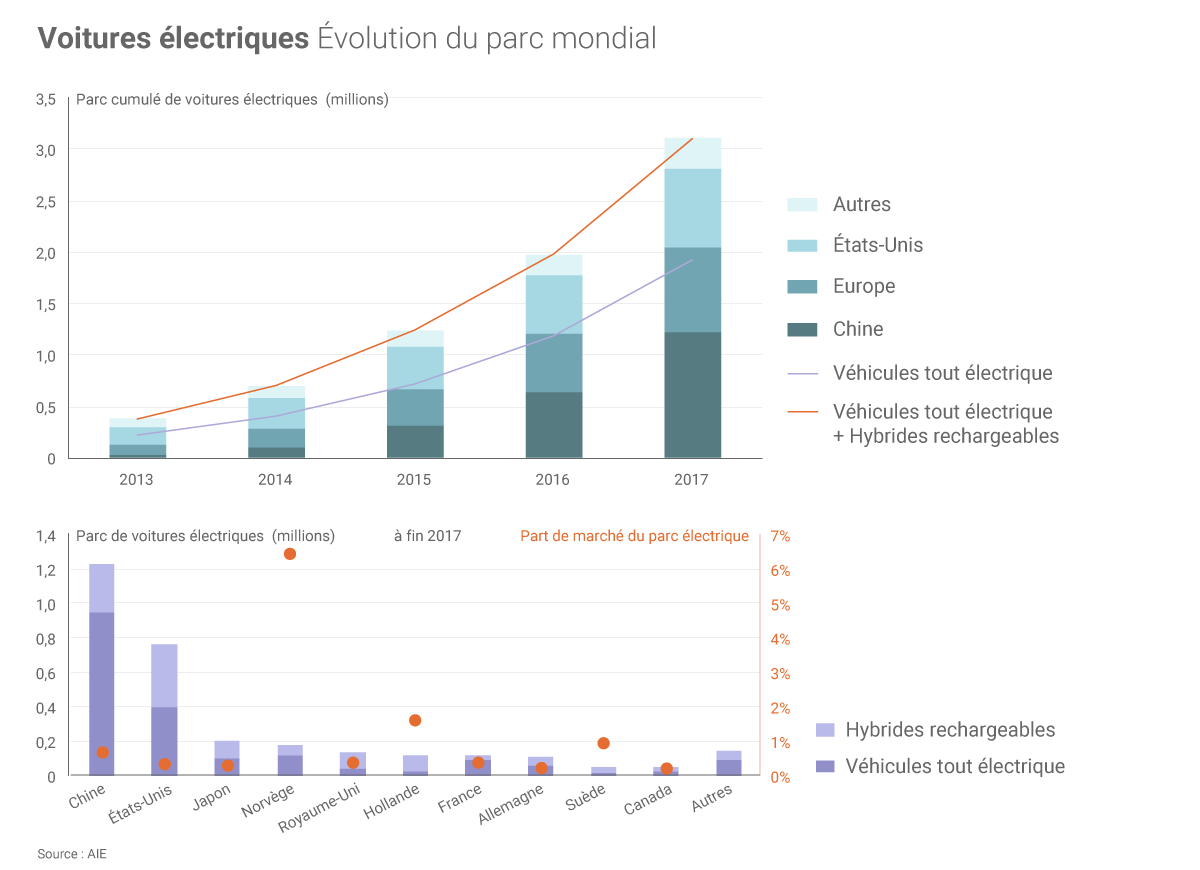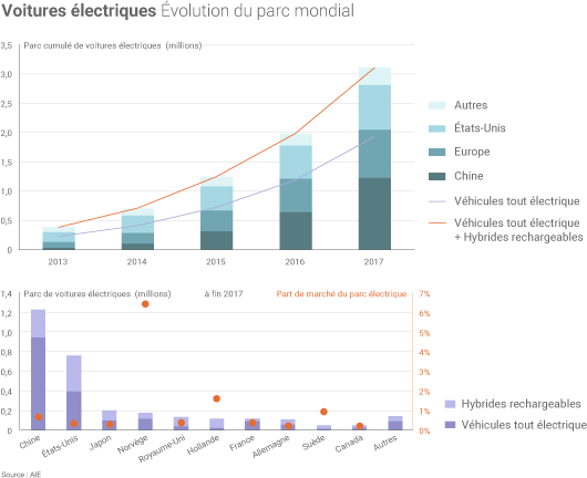Les ventes de voitures « électriques » (au sens large : tout-électrique à batterie, hybrides rechargeables ou à pile à combustible) ont atteint 1,1 million d’unités dans le monde en 2017, soit 54% de plus qu’en 2016 selon le Global Electric Vehicles Outlook de l’AIE. La Chine a à elle seule compté pour plus de la moitié de ces ventes en 2017 (580 000 ventes, + 72% par rapport à 2016), loin devant les États-Unis, deuxième marché des voitures électriques (280 000 ventes en 2017, + 75%).