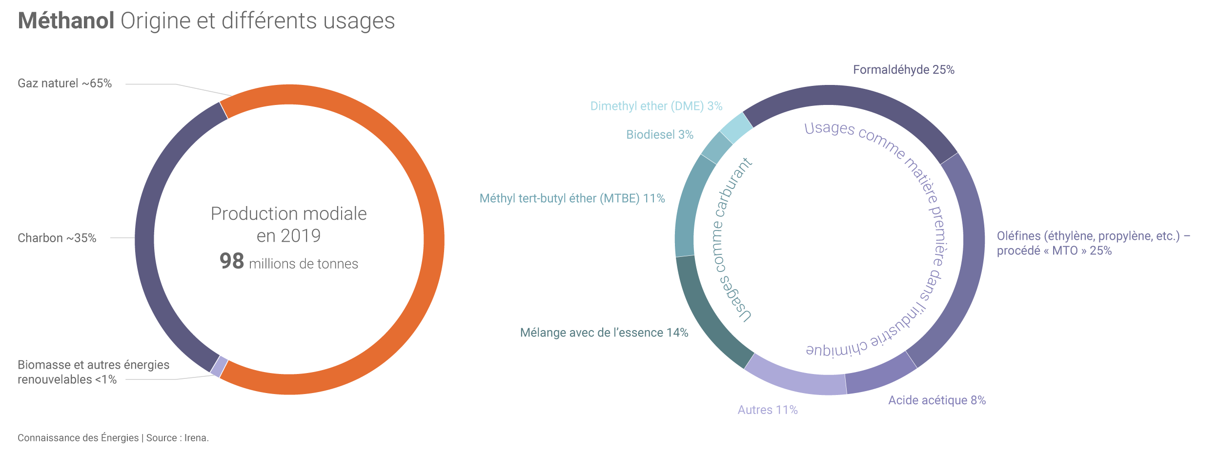 La production mondiale de méthanol a quasiment doublé au cours de la dernière décennie pour atteindre près de 98 millions de tonnes en 2019, dont moins de 0,2 million de tonne à partir d'énergie renouvelable. (©Connaissance des Énergies, d'après Irena)