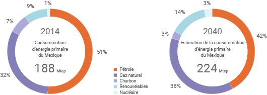 En 2014, le pétrole comptait pour plus de la moitié de la consommation d’énergie primaire du Mexique selon les dernières données de l’AIE. Il occupait ainsi une place plus importante dans le mix énergétique de ce pays que dans ceux de plusieurs pays du Moyen-Orient(2). Les énergies renouvelables et l’énergie nucléaire (2 réacteurs dans le pays) ne satisfaisaient pour leur part qu’environ 10% de la consommation mexicaine d’énergie.