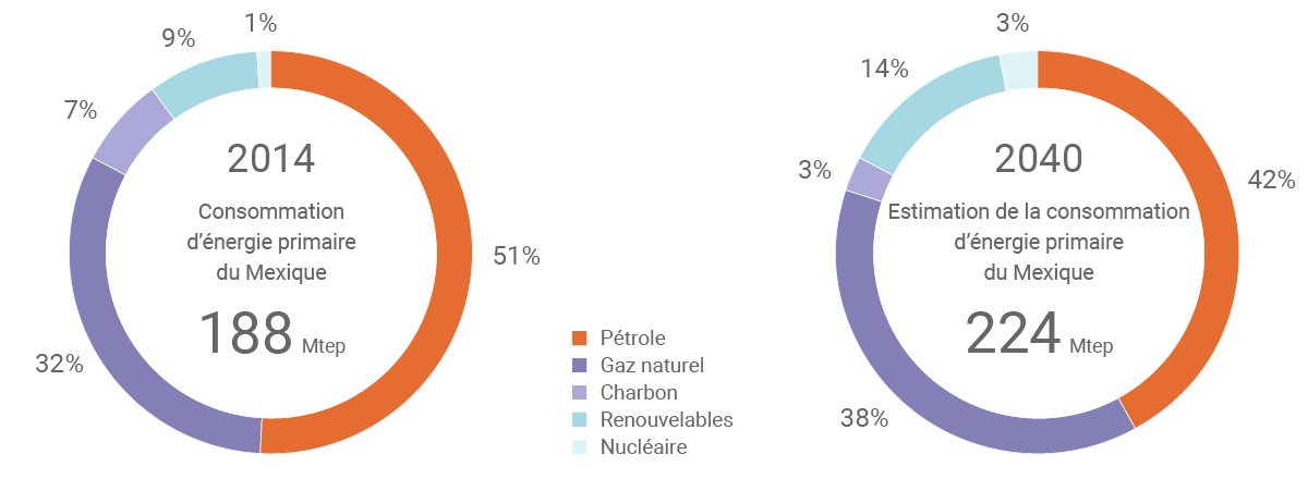 Malgré la hausse de la production pétrolière, la part très importante du pétrole dans la consommation énergétique mexicaine devrait baisser dans les prochaines décennies au profit du gaz naturel et des énergies « décarbonées » (renouvelables et nucléaire). Dans ses projections à l’horizon 2040, l’AIE envisage que la hausse de la consommation d’énergie finale sera satisfaite pour moitié par une augmentation de la production électrique.