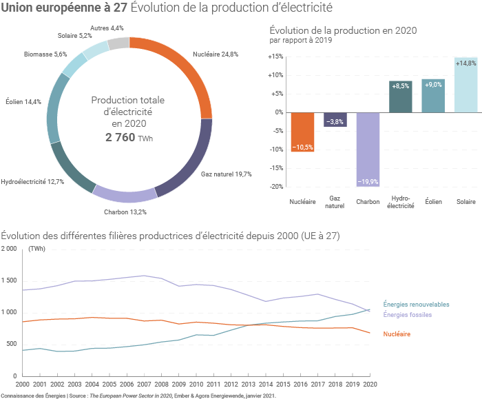 En 2020, les différentes filières renouvelables auraient, avec 1 054,3 TWh produits dans les 27 États membres, compté pour 38,6% du mix électrique de l'Union européenne selon les think tanks Ember et Agora Energiewende.