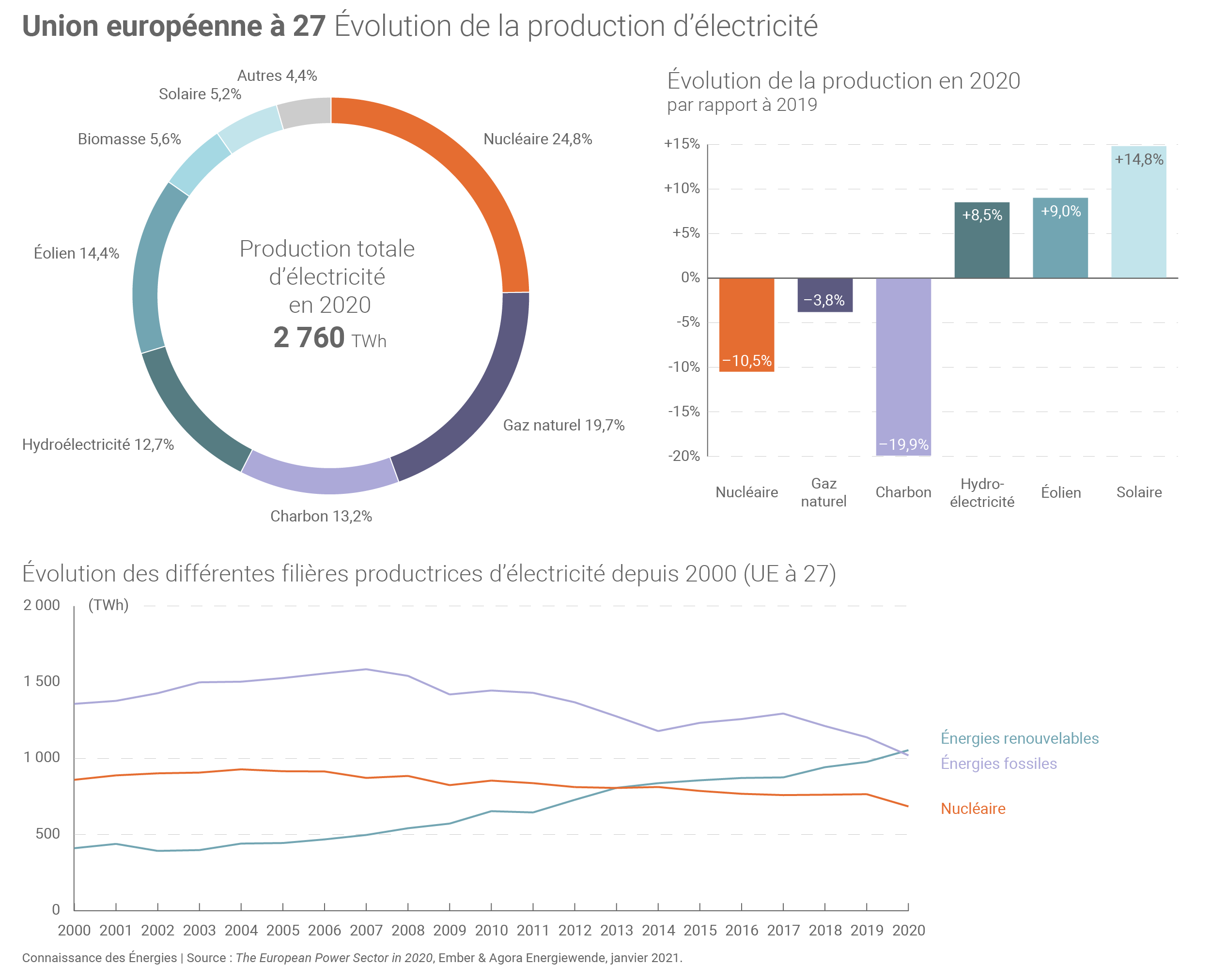 L'énergie nucléaire reste quant à elle la principale filière productrice d'électricité dans l'Union européenne (24,8% du mix électrique de l'UE en 2020) même si elle a connu une année « historiquement mauvaise » en 2020 (baisse de 10,5% de la production par rapport à 2019).