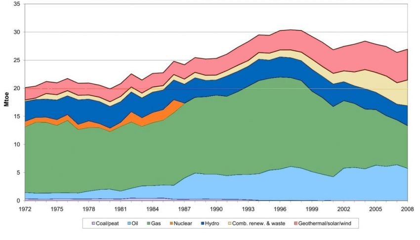 Production d’énergie en Italie de 1972 à 2008 (d’après AIE)