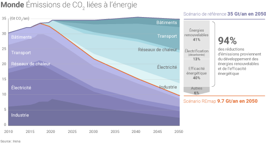 Pour atteindre la cible des 2°C, les énergies renouvelables devraient satisfaire les deux tiers de la consommation d’énergie primaire en 2050 dans le scénario REmap de l’Irena, contre seulement 15% en 2015 (et 32% en 2070 dans le scénario de Shell). Cela correspondrait à « une accélération d’un facteur au moins 6 (du rythme de développement) des énergies renouvelables » selon l’agence, et ce dans les différents secteurs (production électrique, chaleur, transports, etc.). L’intensité énergétique mondiale, c’est-à-dire la consommation d’énergie par point de PIB, devrait quant à elle chuter des deux tiers d’ici à 2050 (elle a baissé de 1,7% en 2017).