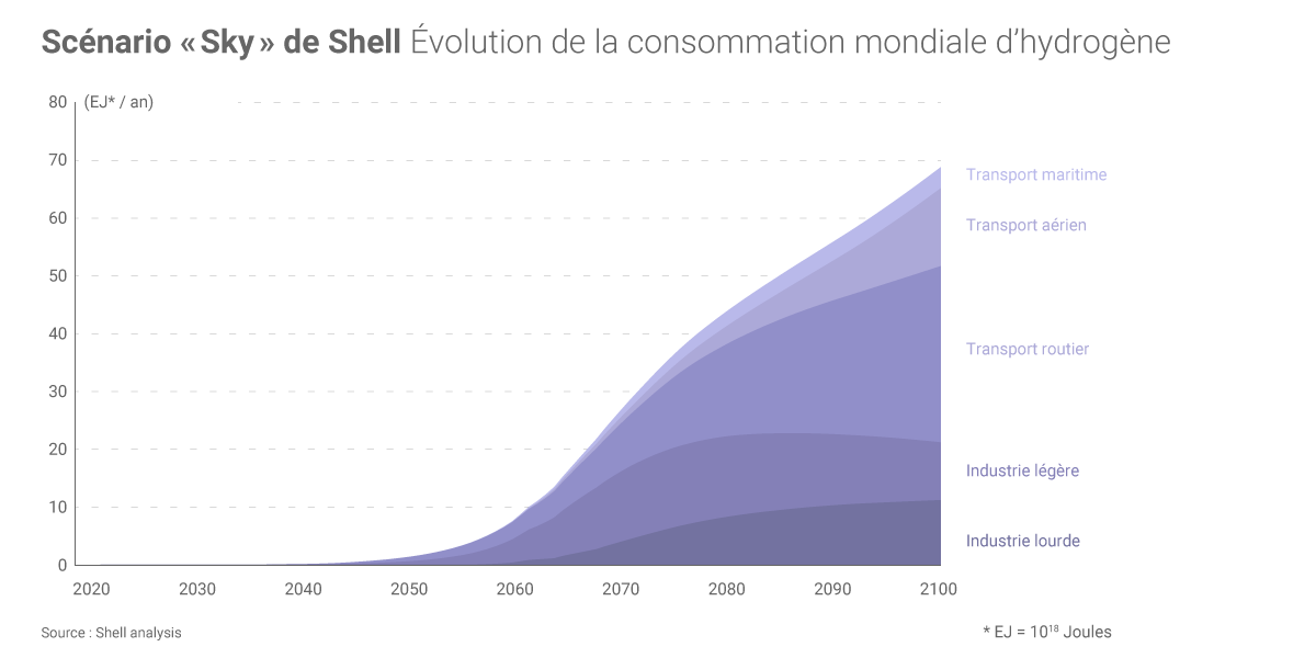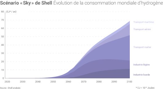 Le vecteur hydrogène « émergerait » à partir de 2040 dans le scénario « Sky », et augmenterait progressivement dans la consommation finale d’énergie, jusqu’à compter pour 10% du mix mondial en 2100. A cet horizon, il pourrait en particulier satisfaire près d’un quart de la demande énergétique des transports. Cet hydrogène serait produit par électrolyse de l’eau selon Shell, en s’appuyant au début sur les pics de production d’unités renouvelables intermittentes (puis en s’appuyant sur « la production électrique de base »).