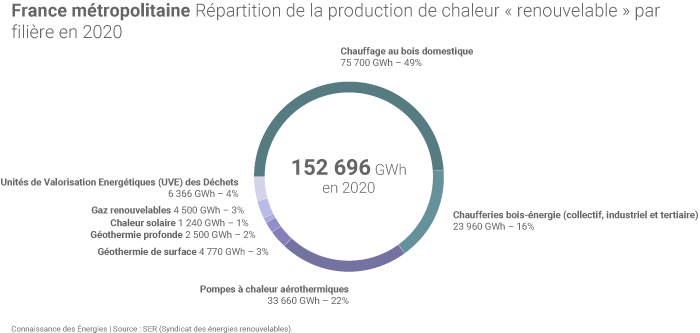 En 2020, près de 65% de la production de chaleur renouvelable en France métropolitaine provenait du bois, en incluant le chauffage au bois domestique d’une part et les chaufferies bois-énergie d’autre part (qui alimentent pour une partie d’entre elles des réseaux de chaleur).