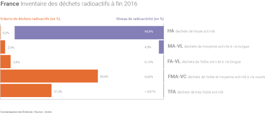 Au total, les déchets FMA-VC ne comptent toutefois que pour 0,03% du niveau de radioactivité total des déchets comptabilisés par l’Andra. À l’inverse, les déchets de haute activité (HA) qui ne constituent que 0,2% du stock de déchets radioactifs en France, sont responsables de près de 95% de la radioactivité des déchets mentionnés par l'inventaire.