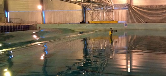 Maquette du Polar Pod face à la formation d'une houle simulée de 20 m à l'échelle 1/41, dans le bassin de l’École Centrale de Nantes (©Polar Pod)