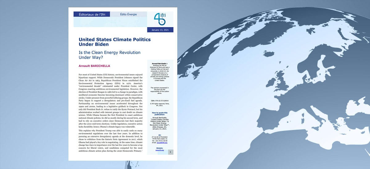 « Pour la première fois dans l'histoire des États-Unis, le changement climatique a constitué une thématique centrale lors de l'élection présidentielle », et plus encore au cours de la primaire des Démocrates qui a « contraint Joe Biden à revenir sur ses propositions initialement modérées et à présenter un plan beaucoup plus ambitieux connu sous le nom de Clean Energy Revolution », rappelle Arnault Barichella dans l’éditorial en anglais ci-après publié le 13 janvier par le Centre Énergie & Climat de l’Ifri.