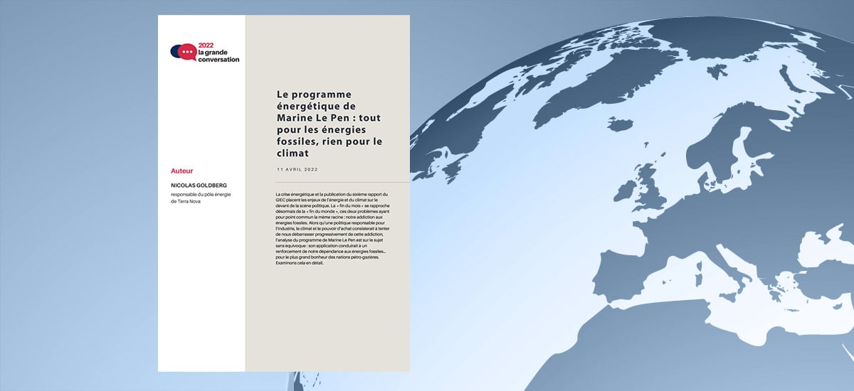 Dans la note-ci après publiée le 11 avril par Terra Nova, Nicolas Goldberg (responsable du pôle énergie du think tank) explique comment l'application du programme de Marine Le Pen « conduirait à un renforcement de notre dépendance aux énergies fossiles » et déplore une « folie des grandeurs » de la candidate sur la question du nucléaire (construction de 20 EPR « dès 2036 », en contradiction avec les propositions de la filière).