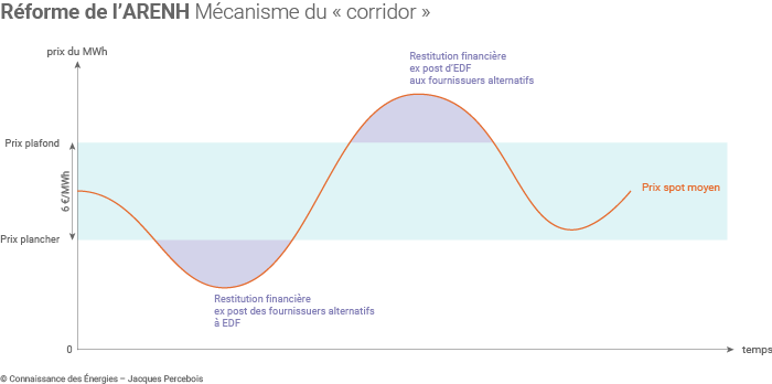 Le projet de réforme prévoit que la quasi-totalité de la production nucléaire d’EDF soit à l’avenir vendue sur le marché de gros. Ce volume d’électricité serait « ouvert » aux différents fournisseurs d'électricité qui pourraient en bénéficier au prorata de leurs portefeuilles de clients. Le prix payé par ces fournisseurs devrait rester compris entre un prix plancher et un prix plafond fixés par la CRE (en cas de prix spot inférieur au prix plancher, les fournisseurs alternatifs devraient verser la différence à EDF ; en cas de prix spot supérieur au prix plafond, EDF devrait à l’inverse verser la différence aux fournisseurs alternatifs).