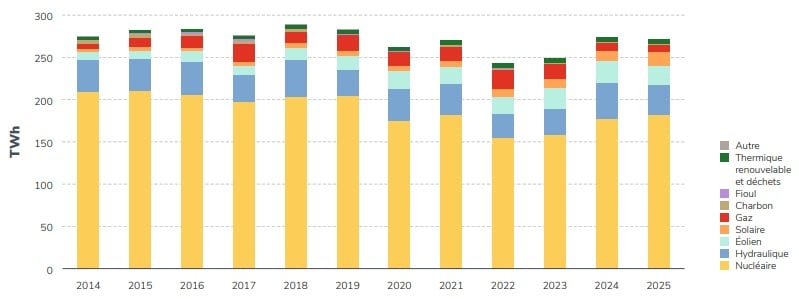 Production d’électricité en France par filière, au cours du premier semestre, entre 2014 et 2025 (source : RTE).