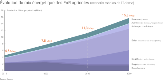 Dans son analyse prospective, l’Ademe estime que la contribution de l’agriculture à la production d’énergie renouvelable « pourrait être multipliée par 2 entre 2015 et 2030 et par 3 entre 2015 et 2050 », atteignant près de 15,8 Mtep à cet horizon (dans le scénario médian de l’Ademe). Dans ce scénario, la part d’énergie renouvelable produite en France « dans le périmètre agricole » atteindrait 23% en 2050(4) (contre 20% en 2015).