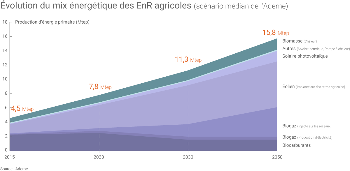En matière d’énergies renouvelables, la contribution « directe » (ex : production de biocarburants et de biogaz) et « indirecte » (ex : mise à disposition de terres agricoles pour l’installation d’éoliennes) de l’agriculture « a été chiffrée à 20% de la production nationale en 2015 » (4,6 Mtep sur les 23 Mtep d’énergie renouvelable produits en France cette année-là), selon les dernières données de l’Ademe.