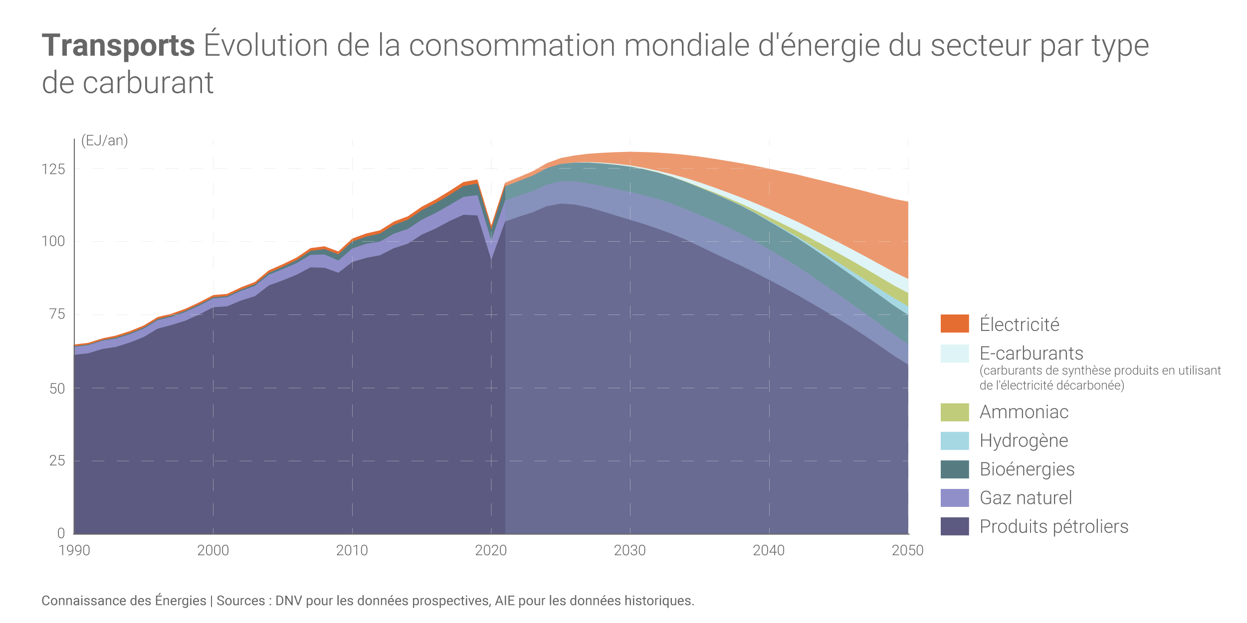 Il est rappelé que le transport de passagers et de marchandises compte actuellement pour environ un quart des émissions mondiales de CO2 liées à l'énergie, DNV jugeant que cette part pourrait s'élever à 30% d'ici 2050 « car une grande partie du système de transport restera tributaire des combustibles fossiles » (et compte tenu de la décarbonation des autres secteurs).