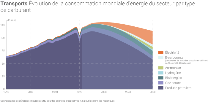 Il est rappelé que le transport de passagers et de marchandises compte actuellement pour environ un quart des émissions mondiales de CO2 liées à l'énergie, DNV jugeant que cette part pourrait s'élever à 30% d'ici 2050 « car une grande partie du système de transport restera tributaire des combustibles fossiles » (et compte tenu de la décarbonation des autres secteurs).