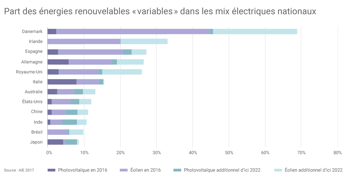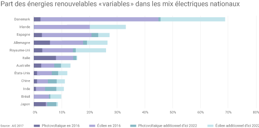 En 2022, la part des énergies renouvelables « variables » (éolien et solaire photovoltaïque) pourrait atteindre près de 70% de la production électrique du Danemark selon l’AIE. Dans certains pays européens comme l’Allemagne et le Royaume-Uni, cette part pourrait dépasser 25% (plus de 10% en Chine et en Inde).
