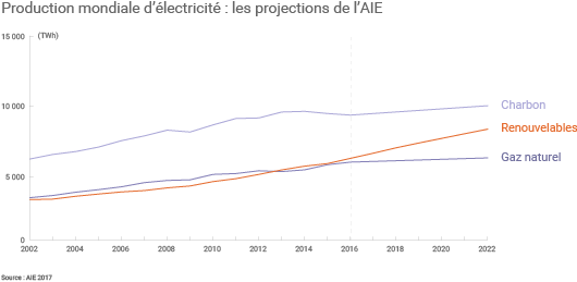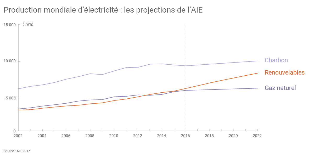 La production électrique mondiale issue de l’ensemble des filières renouvelables pourrait augmenter d’un tiers d’ici 2022 selon les prévisions de l’AIE. Elle dépasserait alors 8 000 TWh par an(4), soit l’équivalent des consommations électriques annuelles de la Chine, de l’Inde et de l’Allemagne réunies à l’heure actuelle.